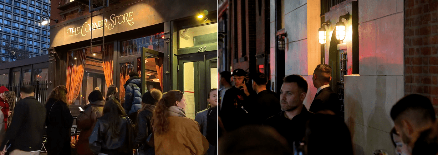The Corner Store (left) and the nondescript guarded entrance of sister restaurant The EightySix (right), the two hardest reservations in NY currently. The only realistic method of securing a reservation to the former requires a $5,000 membership tier on reservation app Dorsia, and The Eighty Six is currently not accepting reservations.