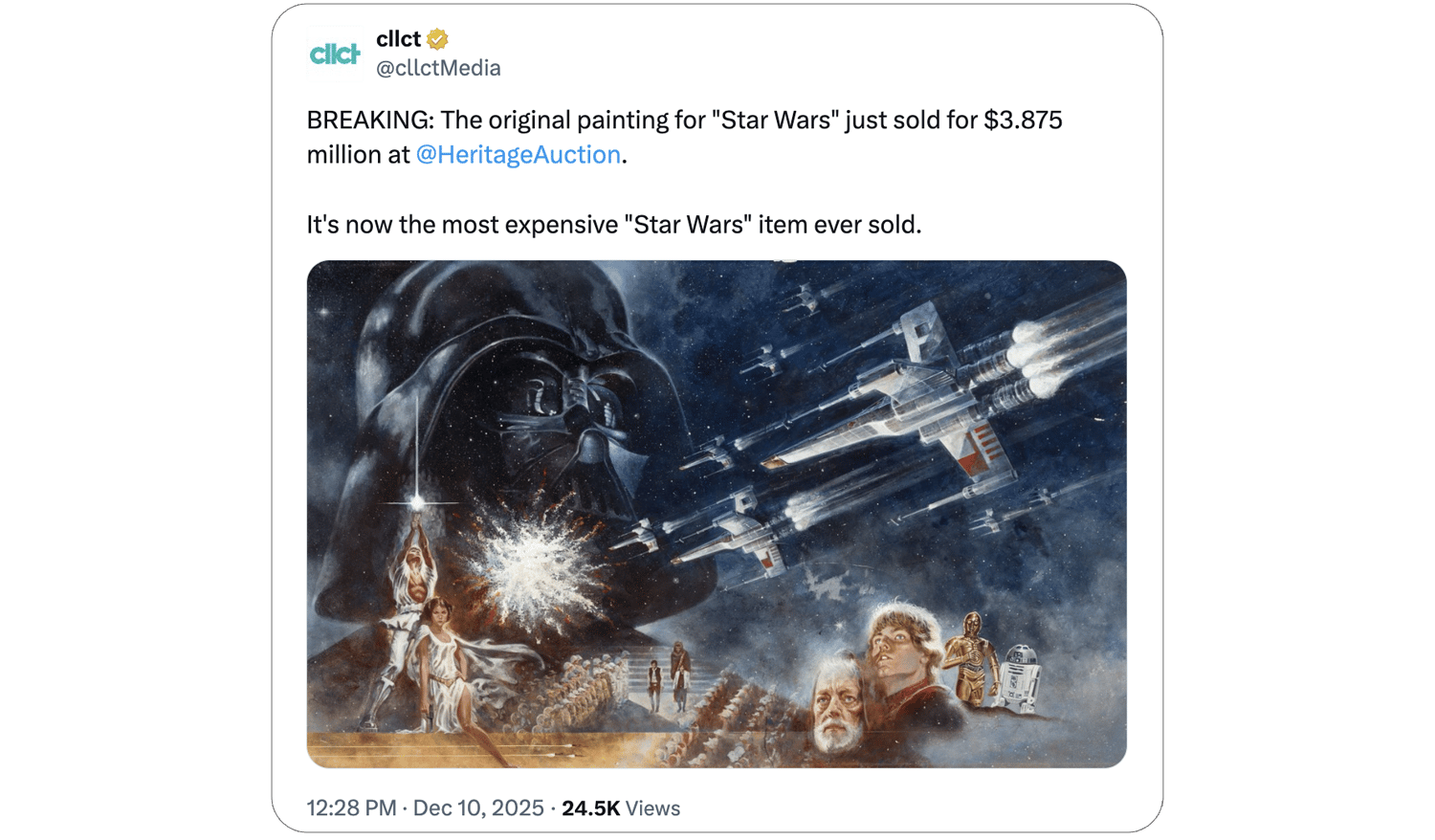 This past week, the original artwork for 'Star Wars: Episode IV' didn’t sell for “around $3M”… it sold for exactly $3.875 million, becoming the most expensive 'Star Wars' item ever sold. The people who follow the space repeated that exact number like scripture all week.