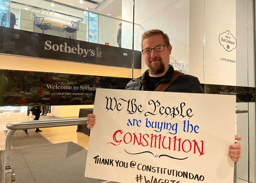 Member and contributor to to ConstitutionDAO, Jeff Graber, who traveled to Sotheby’s HQ for the auction in 2021.