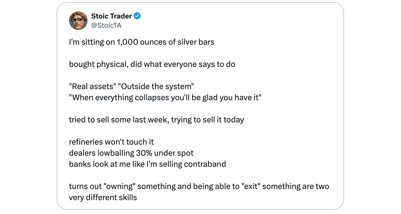 Much like recent rushes into gold or silver, many people are buying now not because they fully understand the asset, but because they can feel that something important is happening. It’s the parabolic nature of ultra-liquid conversation (even when you find out the asset itself isn’t as liquid as you thought when you jumped in and made a quick buck) 👇